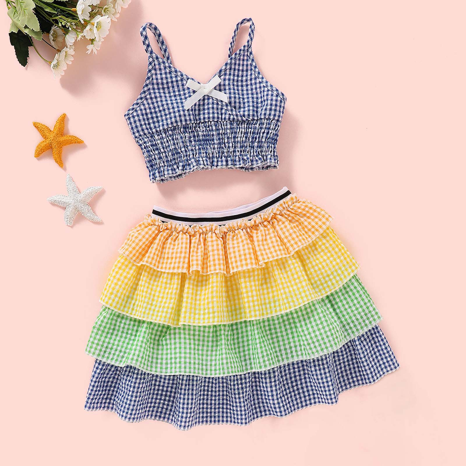 Loopsun Short Sleeve Round Neck Dress Summer Girls Children S Clothing Color Plaid Sleeveless Suspender Top And Half Skirt Two Piece Set Walmart Com